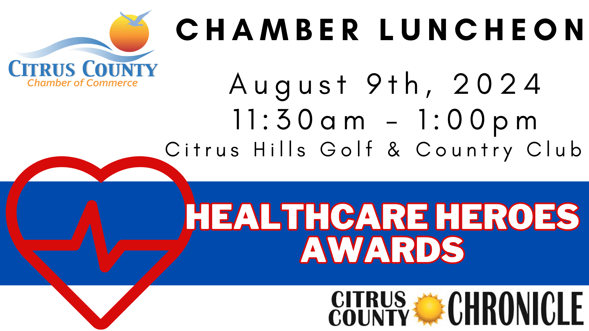 The August Chamber luncheon will feature the Citrus County Chronicle's annual Healthcare Heroes Awards! Join us in recognizing and celebrating these amazing individuals in our community.