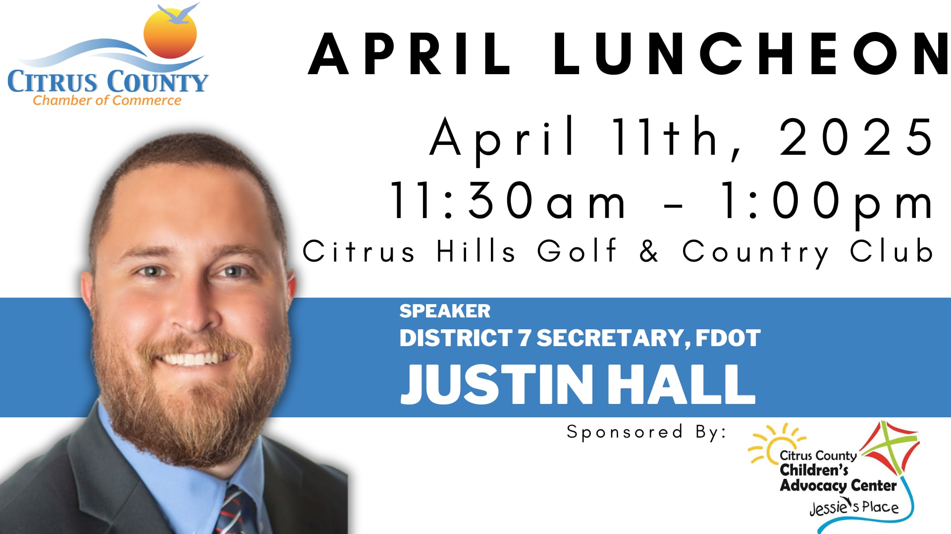 Join the Citrus County Chamber of Commerce for our April Luncheon featuring Keynote Speaker Justin Hall, the newly appointed District 7 Secretary of the Florida Department of Transportation. Secretary Hall will share insights on his recent transition into this leadership role and discuss how the evolving priorities and projects under his direction will shape the future of our district.