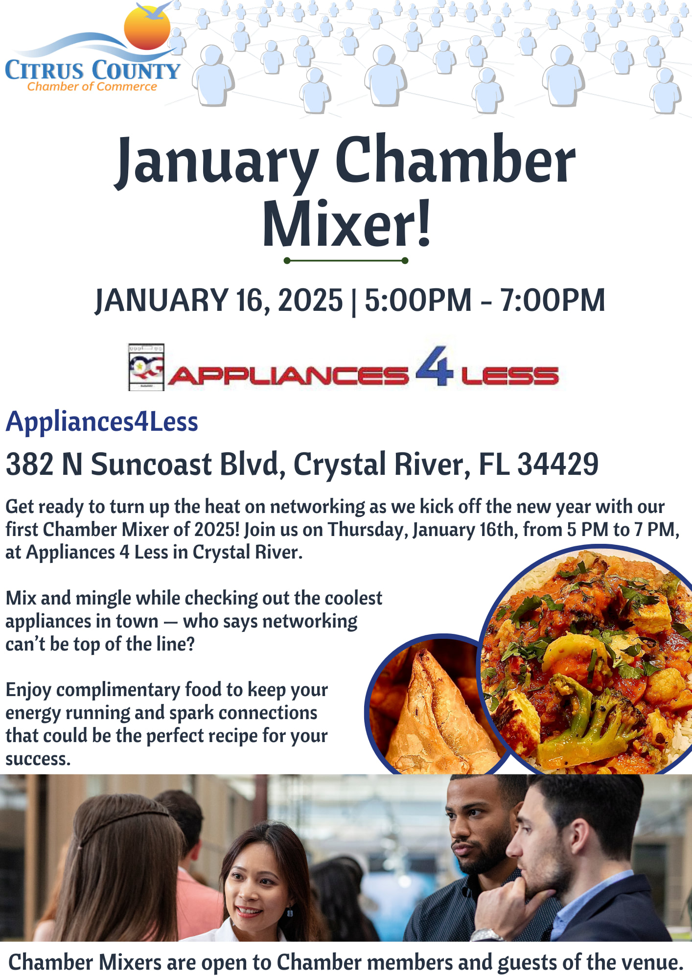 Get ready to turn up the heat as we kick off the new year with our first Chamber Mixer of 2025! Join us on Thursday, January 16th, from 5 PM to 7 PM, at Appliances 4 Less in Crystal River.