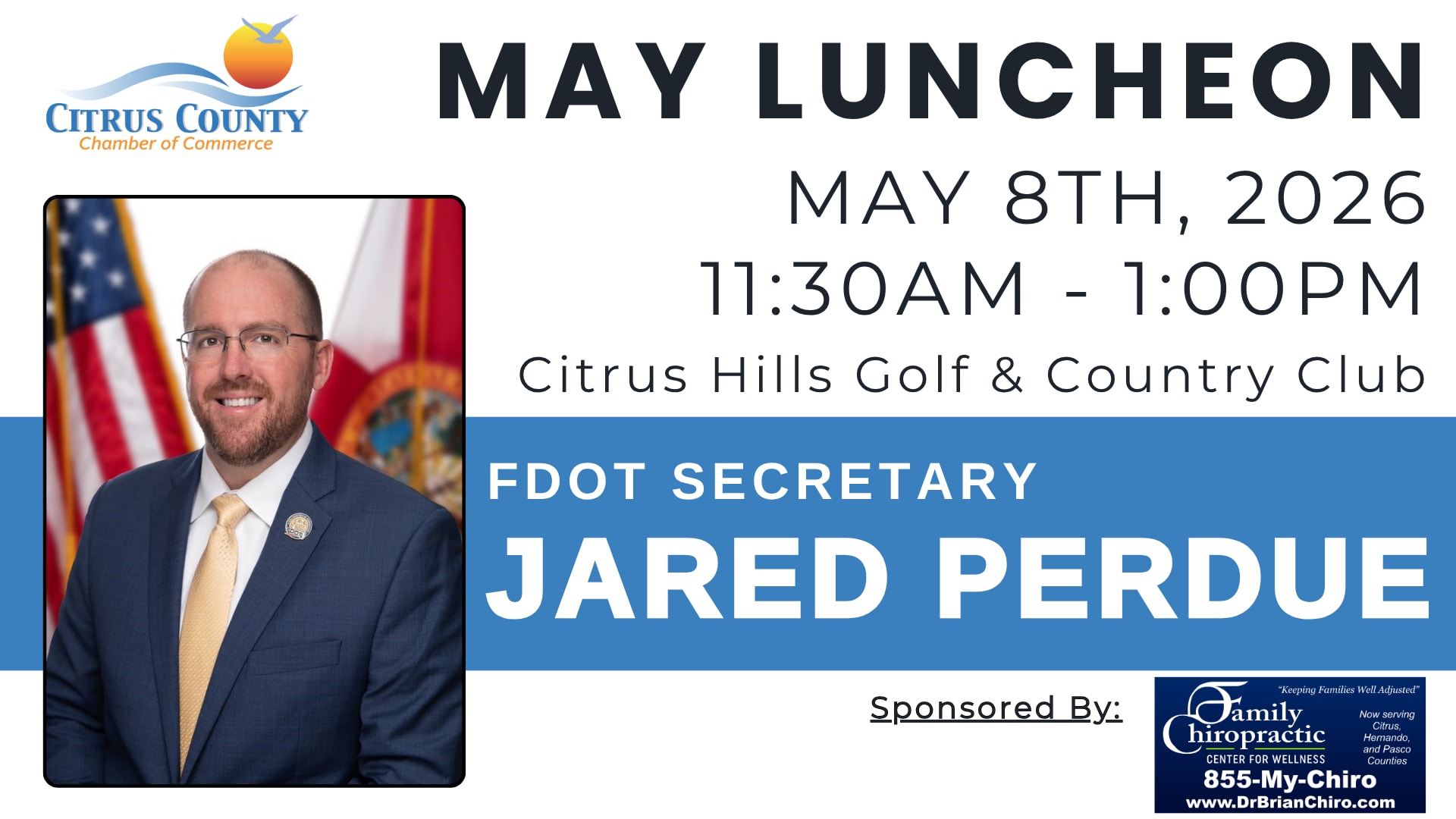 The Citrus County Chamber of Commerce will welcome Florida Department of Transportation Secretary Jared Perdue as the keynote speaker at its May Chamber Luncheon for an update on the Department of Transportation’s five year work plan as it relates specifically to Citrus County.