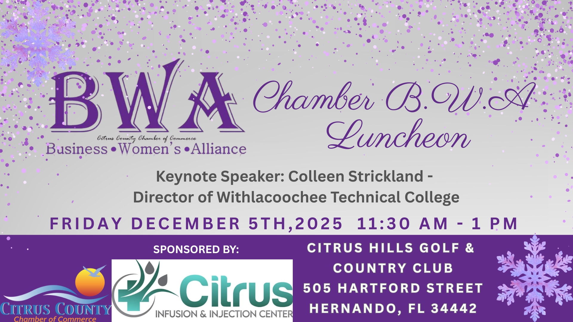 Join the Citrus County Chamber of Commerce for the December Chamber Luncheon, hosted by the Business Women’s Alliance, a committee of the Citrus County Chamber of Commerce, featuring keynote speaker Colleen Strickland, Director of Withlacoochee Technical College.