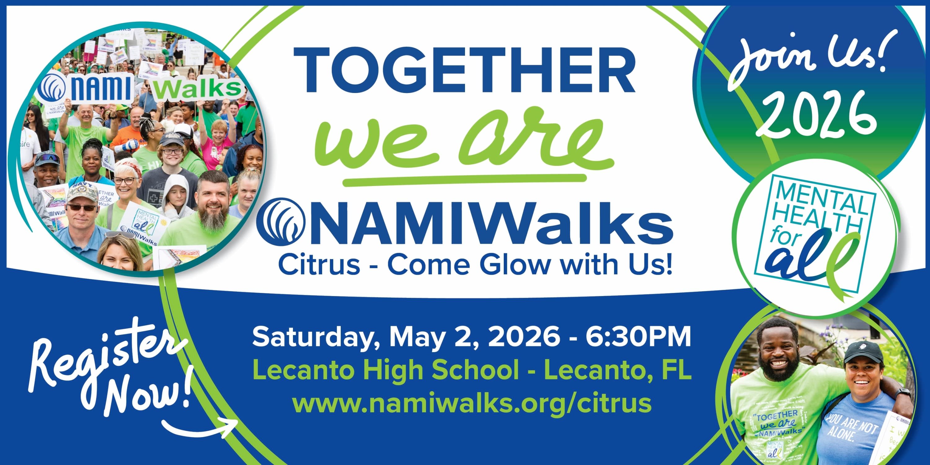 Mental health continues to be at the forefront of the local conversation. To address our community’s growing needs, we invite you to come glow with us for our second annual NAMIWalks Citrus, to bring NAMI Citrus closer to our goal of “Mental Health for All.”
