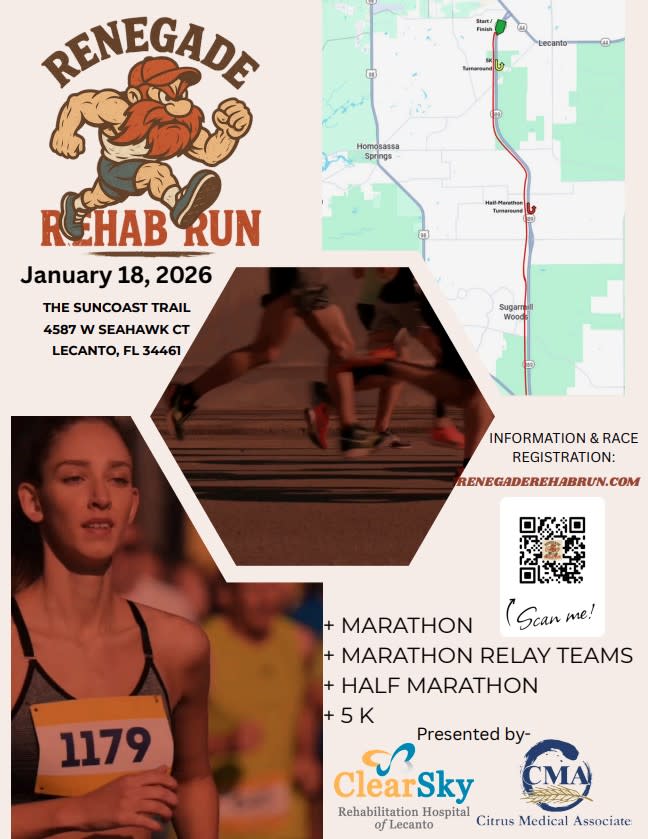 Join us for a Renegade Rehab Run presented by ClearSky Rehabilitation Hospital of Lecanto and Citrus Medical Associates. This run will take place on The Suncoast Trail and include a marathon, marathon relay teams, half marathon and 5K.