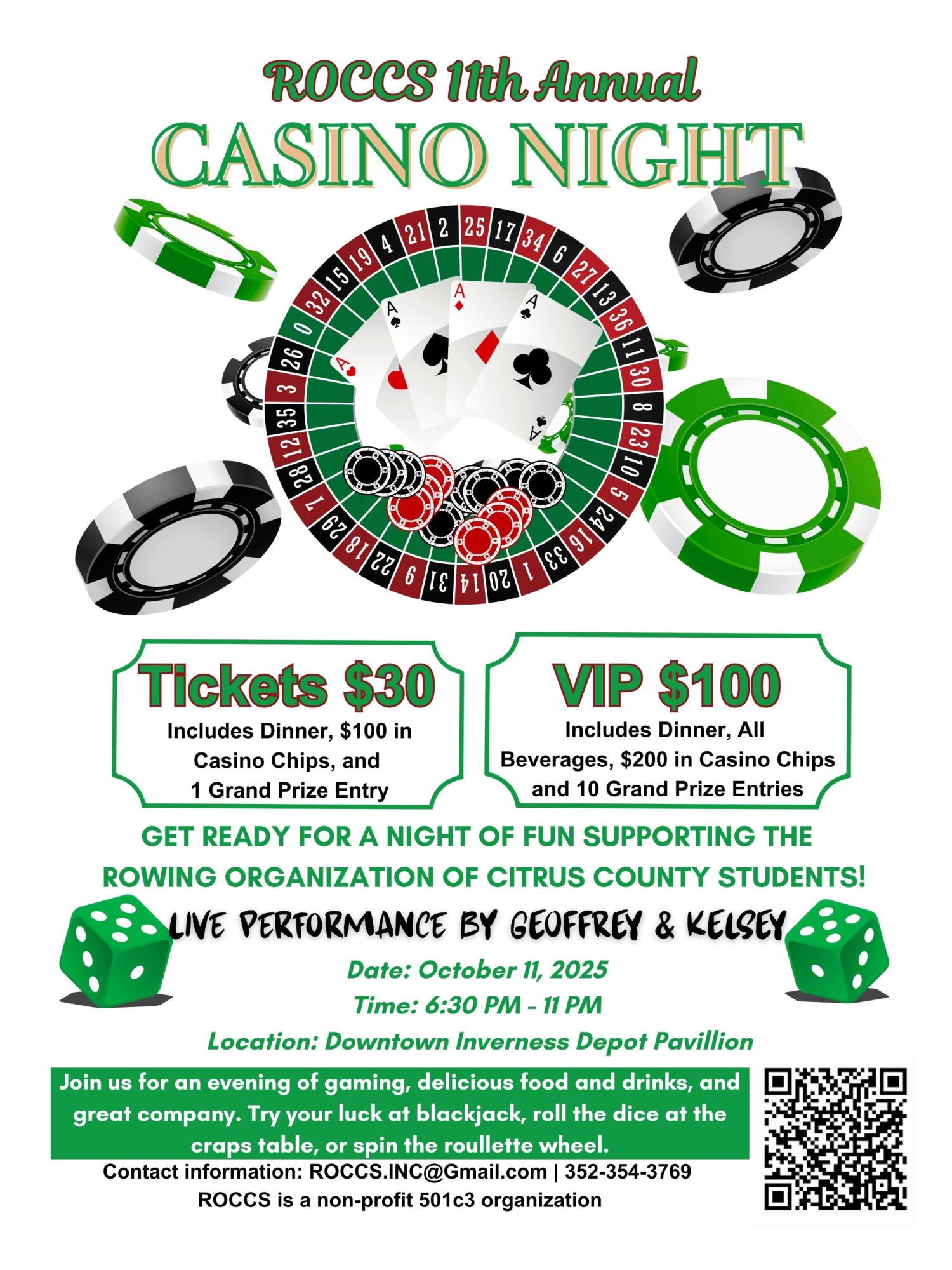 🎟️ Tickets: General Admission – $30: Includes BBQ dinner, $100 in casino chips, and 1 grand prize entry.