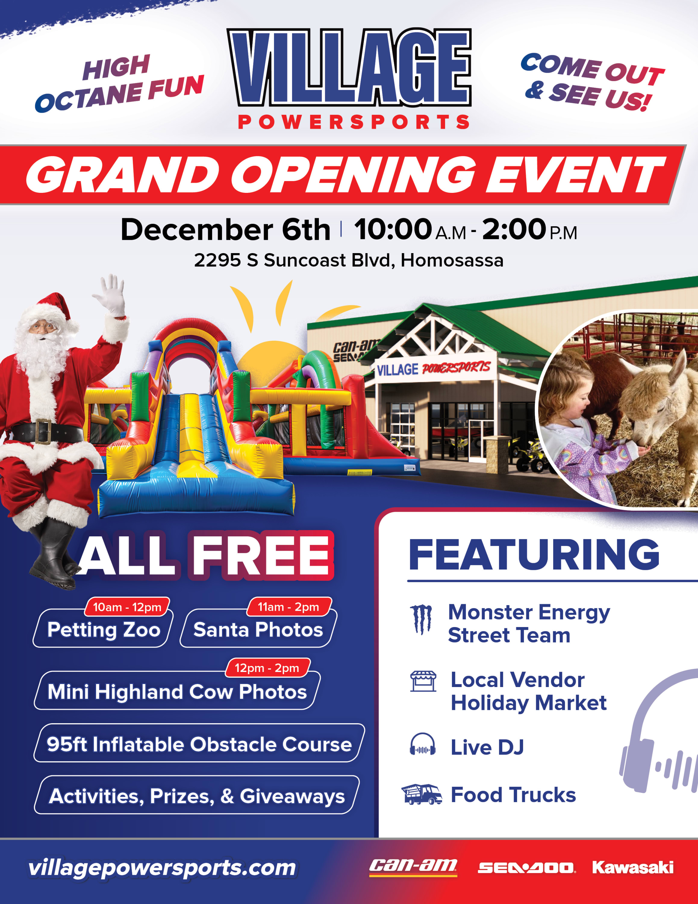 Join us on Saturday, December 6th from 10 AM – 2 PM to celebrate the grand opening of Village Powersports Homosassa, part of the Dimmitt Automotive Group! Enjoy music, food trucks, local vendors, games, and giveaways while exploring our new showroom featuring Sea-Doo, Can-Am, and Kawasaki. This free, family-friendly event is open to the community — come join the fun!Images